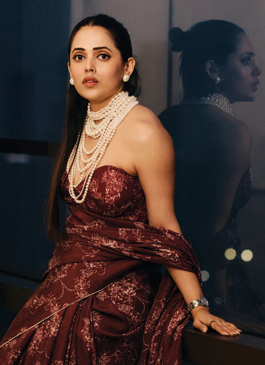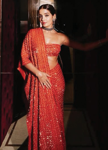 In recent years, jewellery brand Misho’s sculptural body pieces and breastplates have emerged as a celebrity favourite as far as modern sari blouses go. It is also the brand’s founder, Suhani Parekh’s preferred way to style her own saris. “I like reinterpreting tradition in a way that feels true to my style,” she says. “It brings an unexpected edge while letting the sari take centre stage.” The sari is ubiquitous in Parekh’s sartorial lexicon, and one of her standout sari moments was at a gala event in 2023. “I was in my third trimester and I’d styled a vintage bronze silk sari with a 24K gold plated breastplate and belly plate. The sari, the shine, the bump—it all came together in a bold and unexpected way.” Parekh continues to create contrasts that still feel cohesive. Recently, at her high jewellery collection launch in Jaipur, she styled the sari with a blazer and belted it for a sharp and modern look.