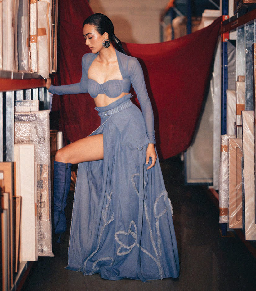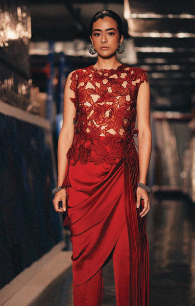 One of their bestsellers is the 3D knit sari-dress. It is a sculpted, calf-skimming, hand embellished dress in their signature knit embroidery on one side, and features a fluid, leather-coated chiffon drape on the other. “It blurs the lines between structure and softness, offering a modern take on the sari that’s both bold and timeless,” says Dang.