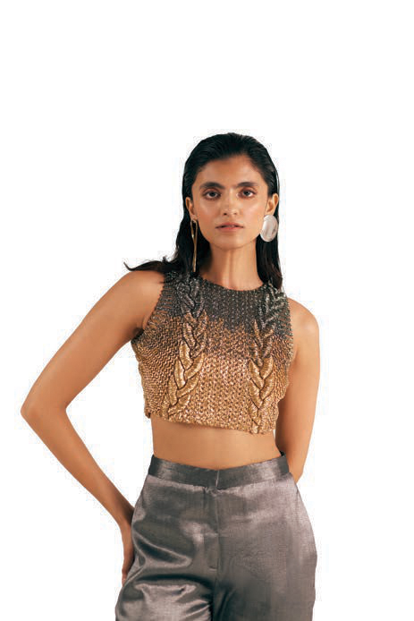 Corsets are having a moment right now, and essé’s structured lightweight versions with gota detailing and metallic embroideries can be paired with a sari, a skirt or layered over a shirt and tailored pants. “It’s the kind of piece that bridges the gap between tradition and contemporary very effortlessly,” says Sahni Malhotra.