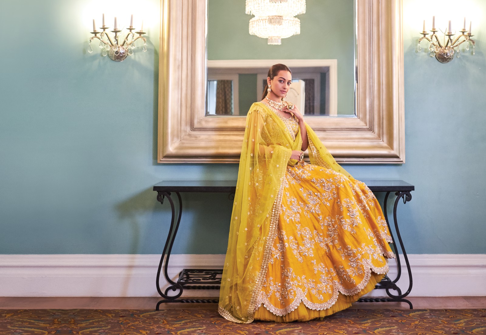 I would dress her in something comfortable. These heavy and overbearing lehengas that weigh more than you, are not my cup of tea at all. It pains me to see some brides crumbling under the weight of their outfits on their d-day.