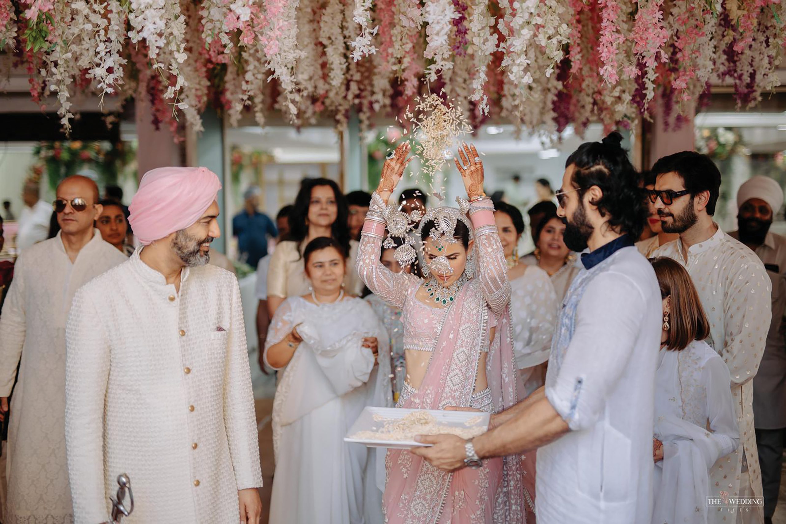 SS: “I always knew I’d wear a Manish Malhotra outfit for my wedding. I had imagined that I’d wear a lehenga on my wedding day and a sari for the reception, but when I saw the wedding sari and Manish explained how the veil would fall, my heart jumped with joy. My friend Poppy, who got married last year, had told me that when it comes to the wedding outfit, I’d just know. And with this outfit, I knew it was the one. I love the colour pink and wanted both pink and green to be a part of my wedding in some way as they are colours of the heart chakra. Also, I have been a bride in so many films that I didn’t want to repeat any look from there, like a red or orange lehenga or red chooda. For me, the most beautiful thing about the outfit was that it had our marriage date and our initials inscribed on it. My veil has ‘S and A’ and ‘7.6.23’, which is our wedding date, embroidered.”